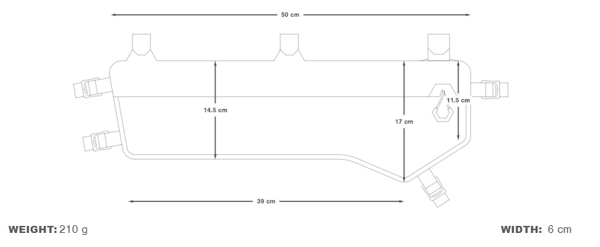 Nepromokavá rámová brašna - odolný materiál, který není sešitý, ale svařován. Díky bezešvé technologii je brašna 100% nepromokavá. Velikost a tvar brašny jsou dimenzovány tak, aby pasovaly do rámů různé velikosti a geometrie.